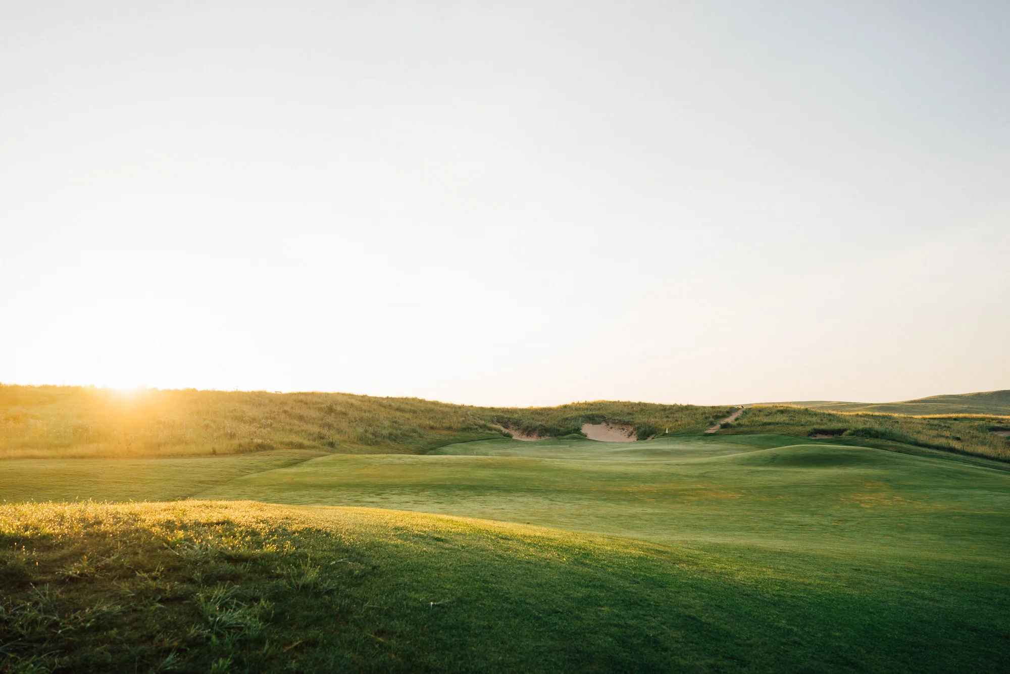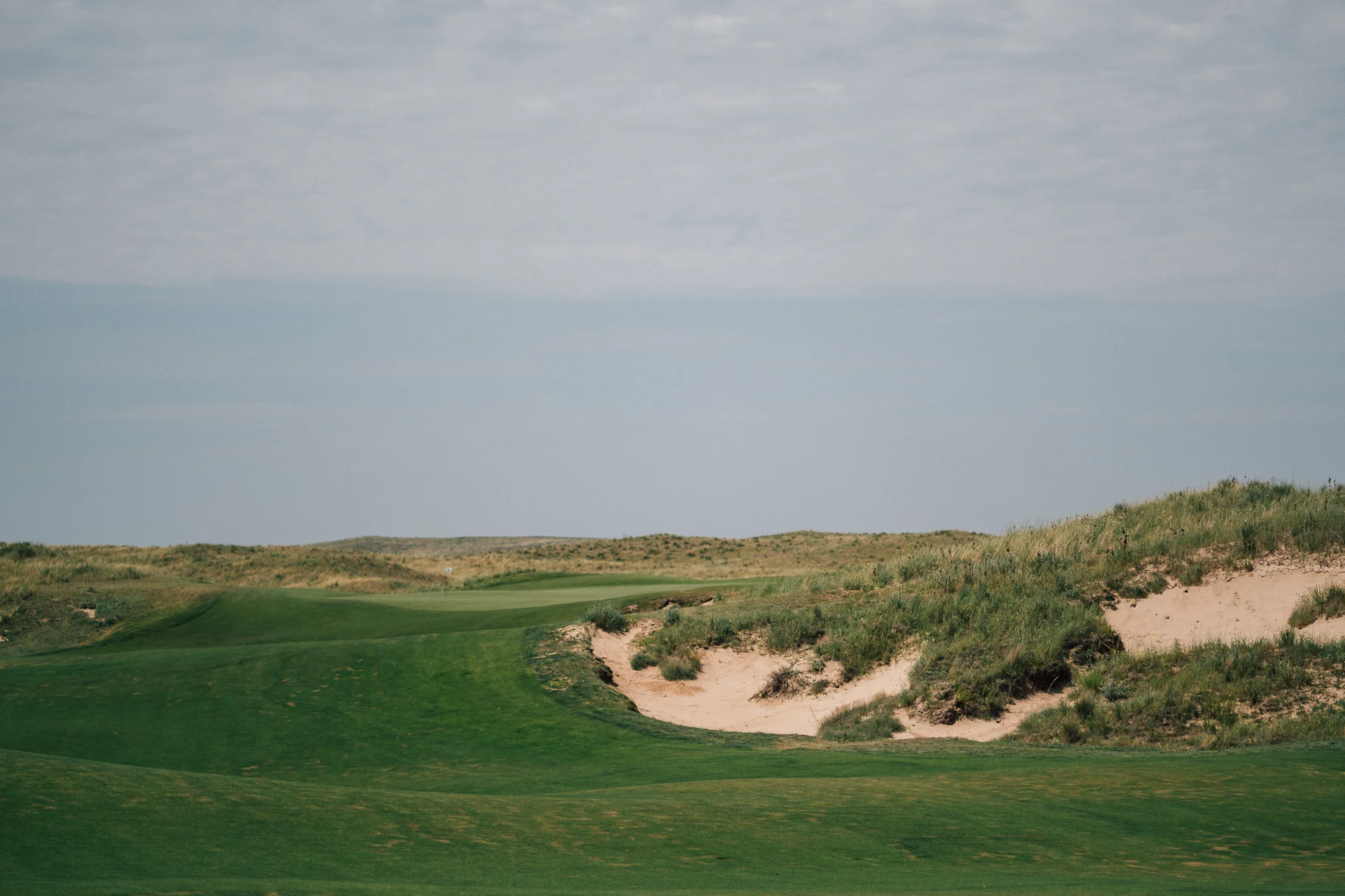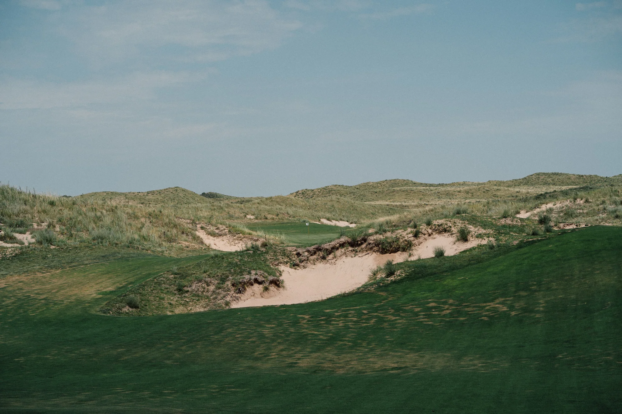 Hitting the crest of the dune is like being transported through a wormhole across the Atlantic into Western Ireland or original Scottish linksland. The awesome dunescape bubbles up out of the earth before crashing into itself creating random snaking waves and contours. Shades of brown and tan are juxtaposed with flashes of verdant greens that weave across, up, and down the dunes. As a stiff, swirling breeze blows from the south the pin flags are starched against the horizon. Dotted across that same horizon are wild, chaotic but artful bunkers and sandy waste areas.