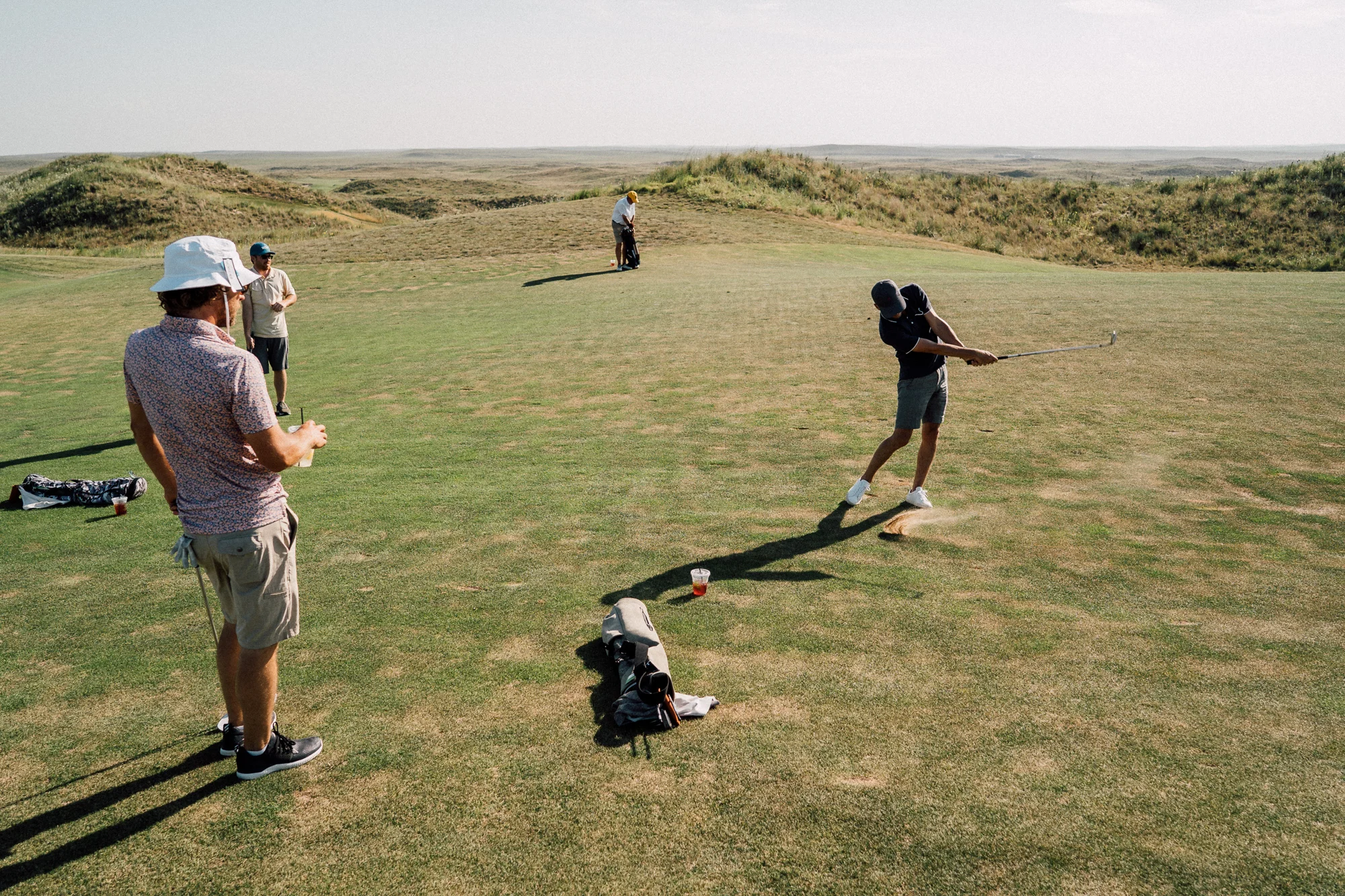 Our round started on the now familiar 1st hole and shockingly I fired off a few decent shots on the uphill par 4. The wide fairways gave way to almost infinite angles and lines of play that seem to either confound the golfer or unleash their inner shot maker. On the 2nd hole, from and elevated tee, we barreled into our round chasing shots up, down, and over hillocks that laid in front of us. Hitting golf shot after golf shot to our own soundtrack we bounced across the sunbaked fairways just like our golf balls. With that steady breeze at our backs mediocre shots at times were followed by heroic ones. Tired and, a little dejected at some of my poor swings, I now faced that same perched view on the 4th tee.